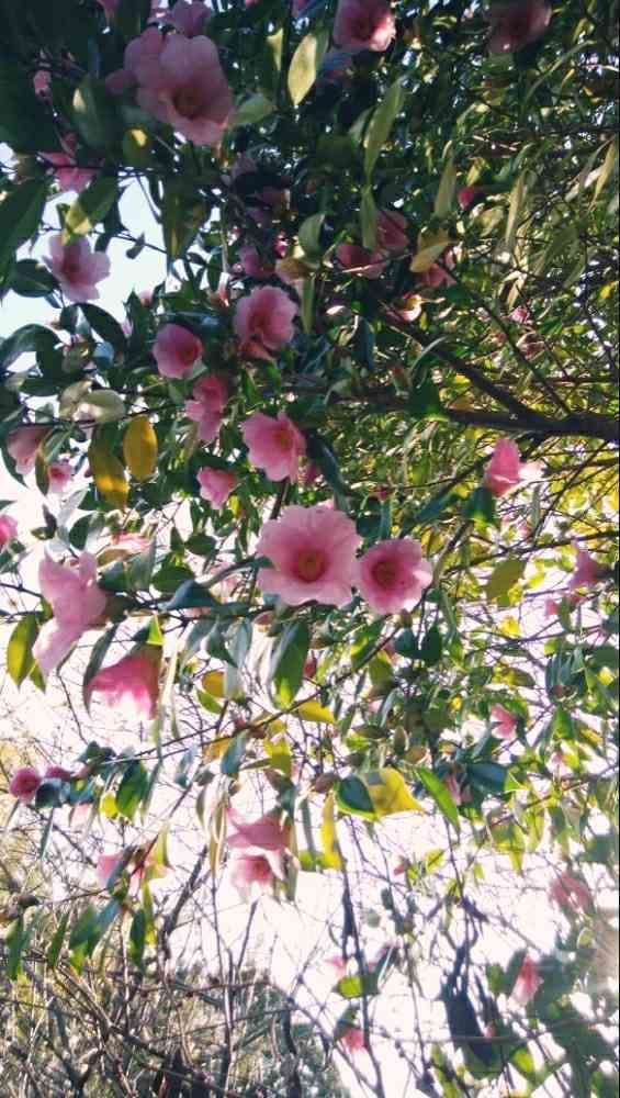 見上げるとピンクの椿が咲いていました。品種は分かりません😓乙女椿も可愛くて好きだけどこの日が透けるような優しい色合いの花弁に癒やされます😌