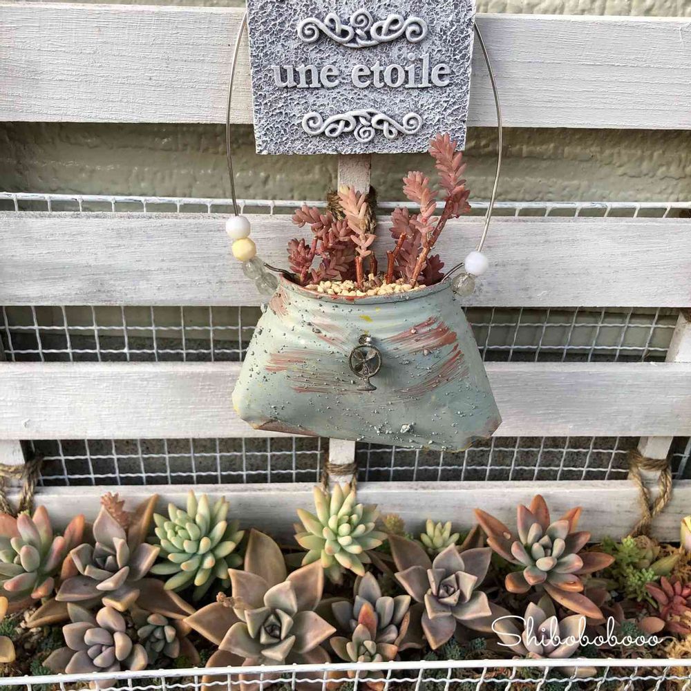 ありがとうございます😊両方とも、皆さんの見よう見まねで初めて作った物です。リメ缶バックは手間がかかるけど、プランターは麻紐で固定しただけで釘無しなので、簡単でしたよー♪