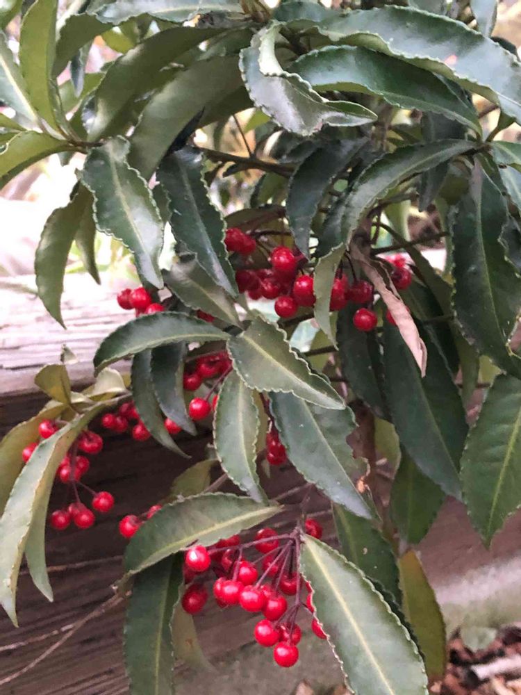 寒空の下、庭の万両が赤い実を残しています