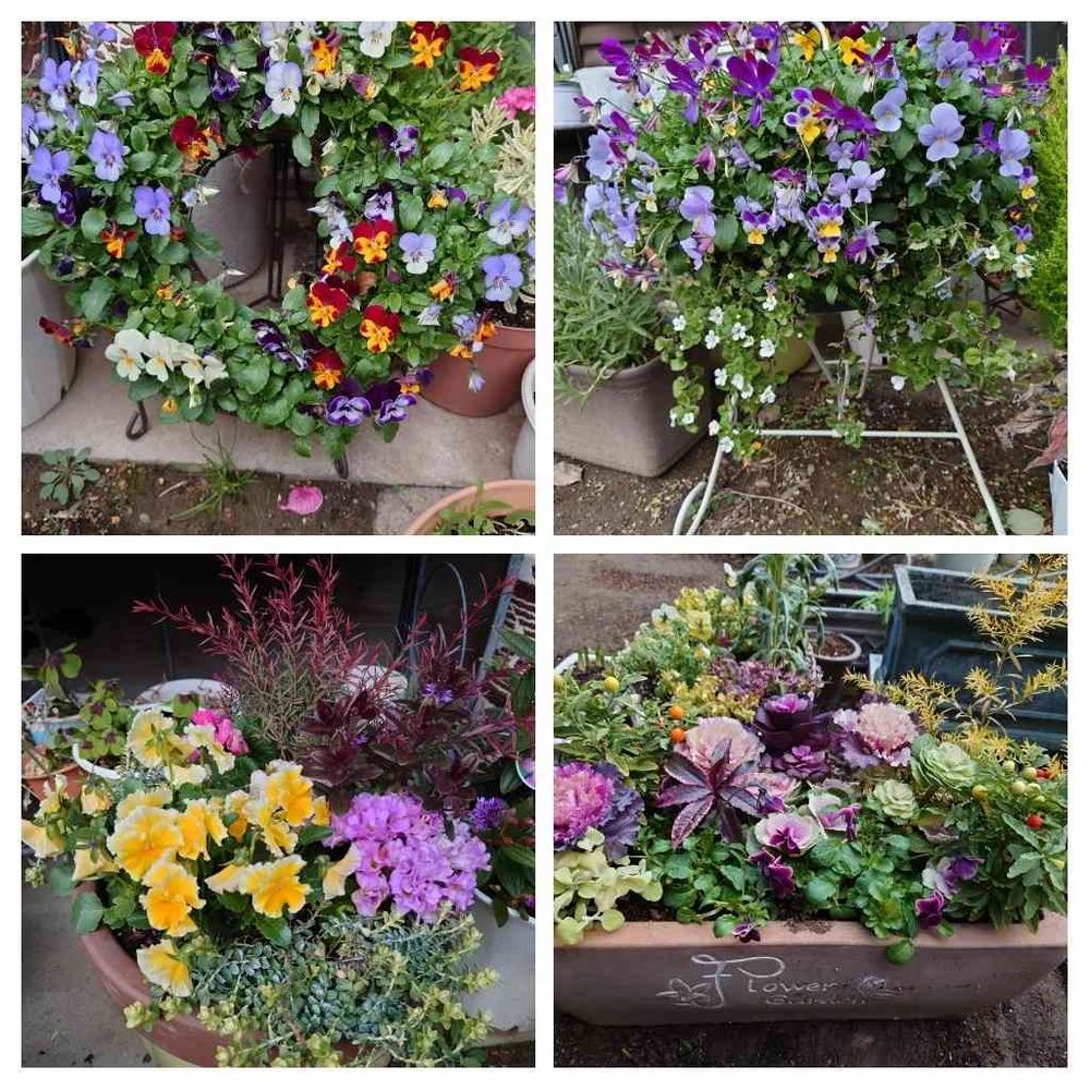 寄植え、ハンギング、リングバスケット。ちょっぴり納得できない出来、ハンギングバスケットはかなり難しい😓(私は苦手です、2回目だけどイメージ通りにいかない😭)