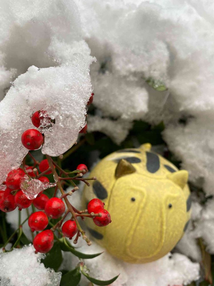 雪から赤い実の南天さんが顔を覗かせてる☺️