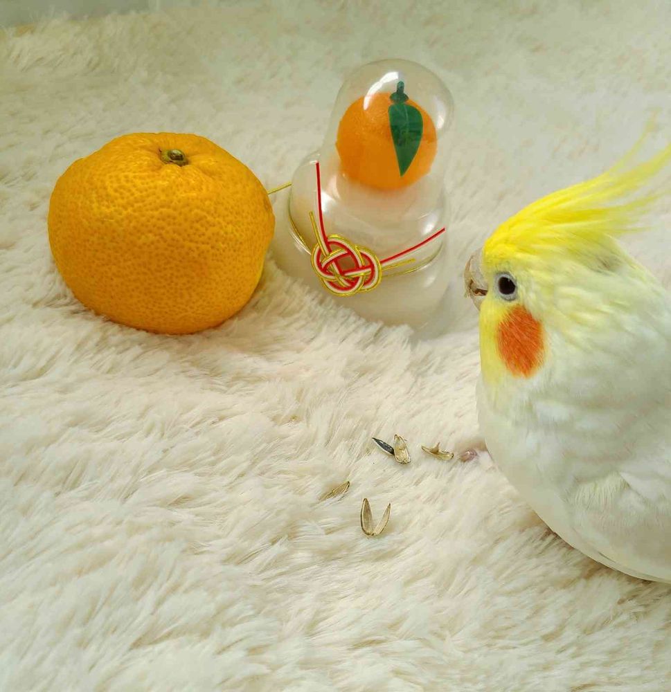 オカメちゃんと柚子くんとミニ鏡餅でごあいさつ🐥🟡