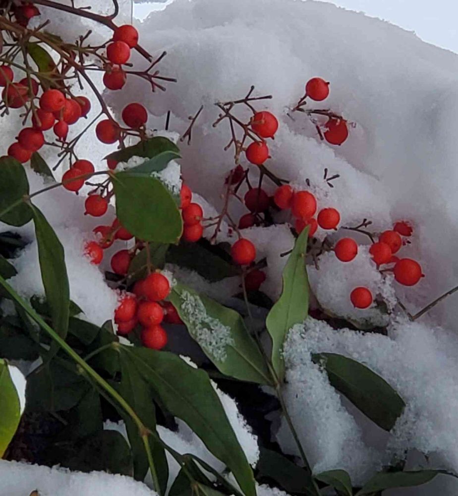 赤の実の南天と白い雪のコントラストが素敵ですね🤗