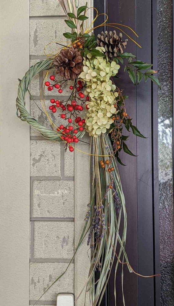 昨年育てた植物と拾ってきた植物で正月スワッグを作りました☺️