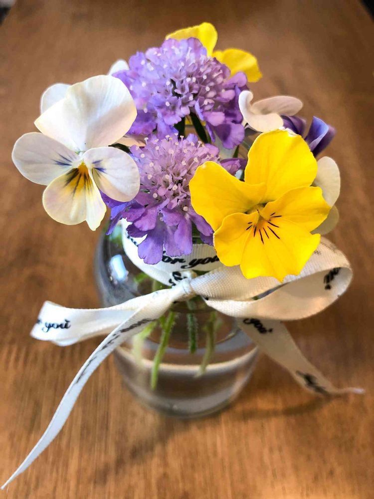 ビオラやスカビオサだけでなく、プリムラジュリアンとかもぴったりサイズなので花がら摘みの後に飾ってます🌸✨