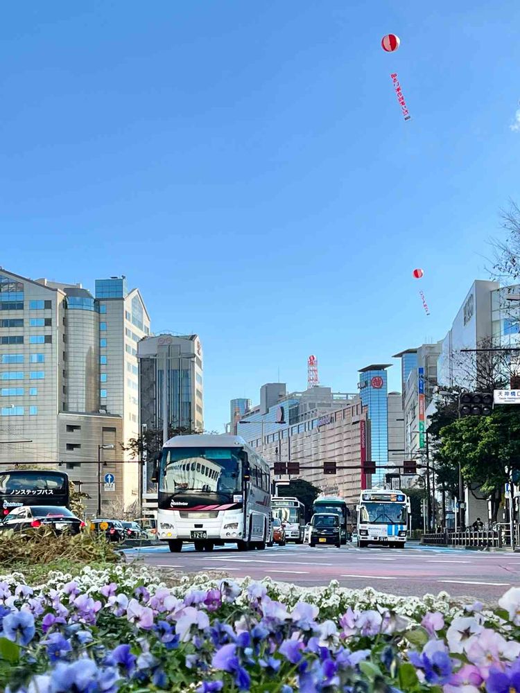 福岡市・天神の初売りで、久しぶりのアドバルーン♪ 随所に花壇のあるまち。