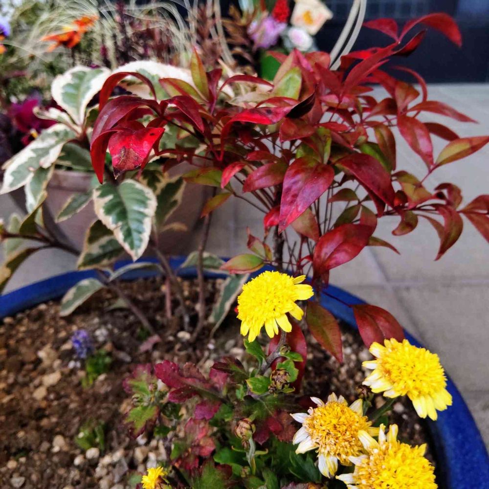 ヤブコウジとムスカリが残っていてくれたので、南天と寒菊と葉牡丹を追加していた
