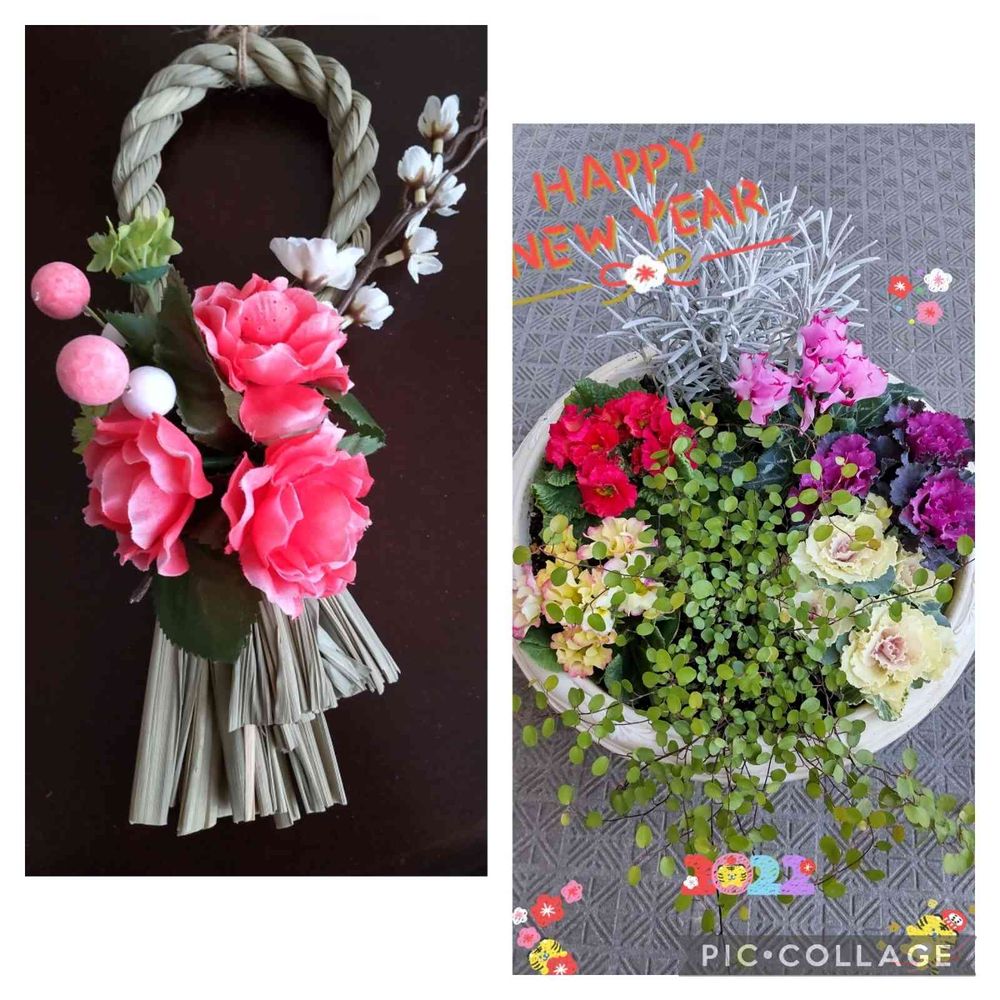 お正月らしいカラフルな寄せ植えと可愛い正月飾りですね🥰