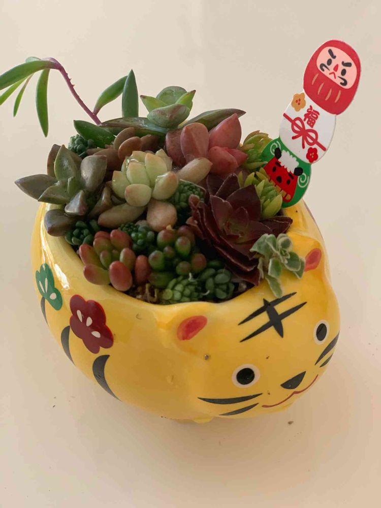 寅ちゃんの鉢はプリンケーキの入っていたものです。ケーキ屋さんで美味しそうなのはもちろんですが、半分は寄せ植え用にしたくて選んじゃいます。笑