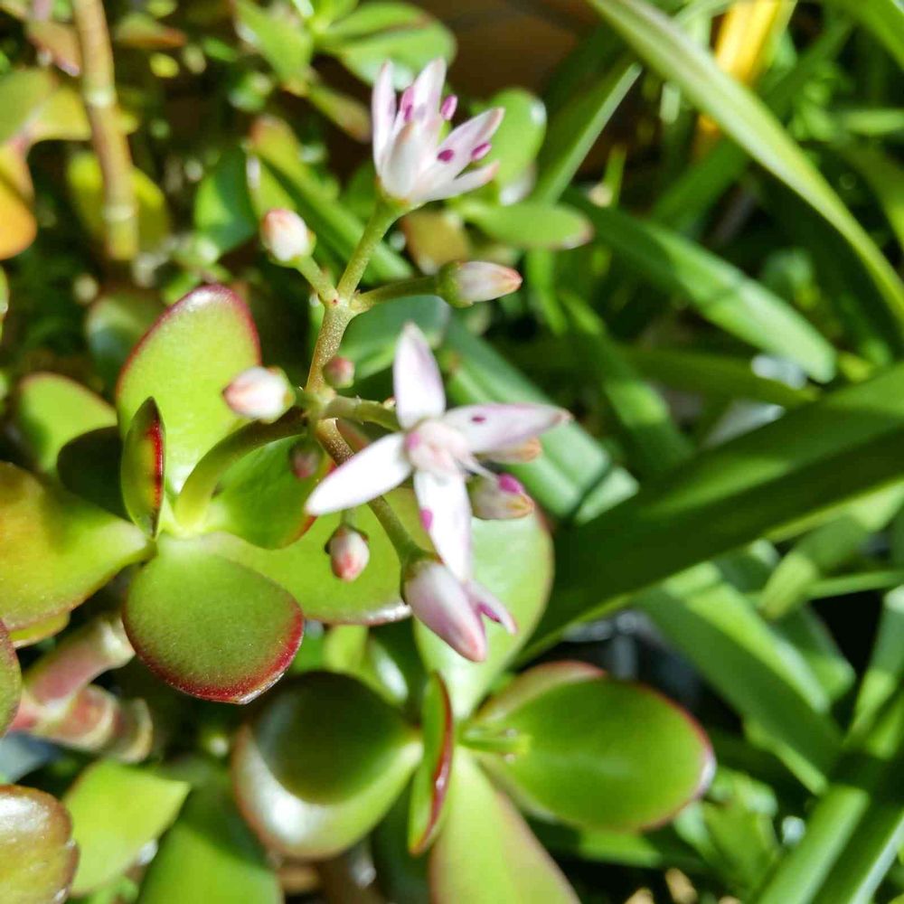 なんと今朝やっと二輪開花しました。金のなる木。友人から頂いたのが、5年前。大木になりましたが、花目が付かなかった。外に出さないと駄目だよと言われました。真冬でも霜がおりりギリギリまで、外に。花目が出てきて室内の日光が当たる所に置いてました。来年は、鉢植え全体に花を咲かせましょう。