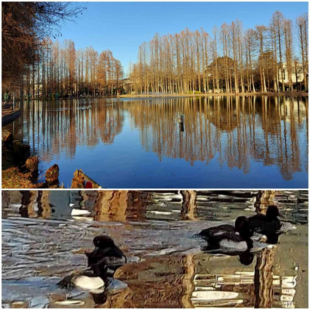 冬の冷たい空気の中❄️静寂している水面に映るメタセコイアの並木がとても素敵でした😃💓🎶
