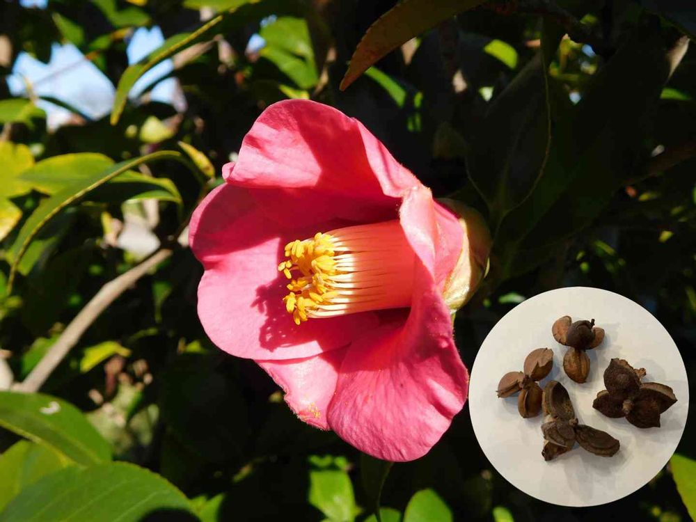 椿の実は普通熟すと硬い殻が三裂し、2〜3個の大きな暗褐色の種子が落ちます。