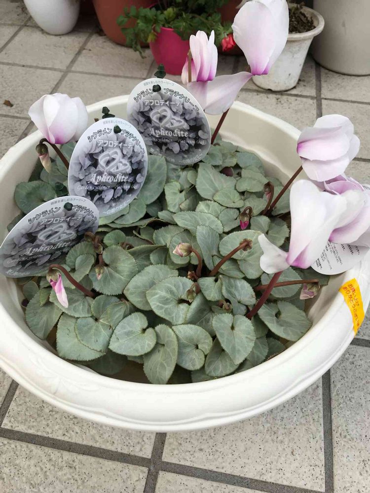 もうシーズンオフなのか1つ100円で5つ、シクラメン プラチナリーフ買った😃👌