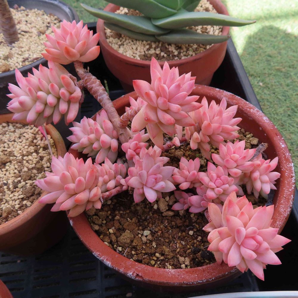 2ヶ月位前に投稿したときは,ほぼ黄色で葉の先端だけがピンクだった樹氷の群生株。温室の中でも氷点下3℃近くまで下がるような寒さのせいで全体がピンクに染まってきた。爪先のピンクの色だけ少し濃いのがいいアクセント。