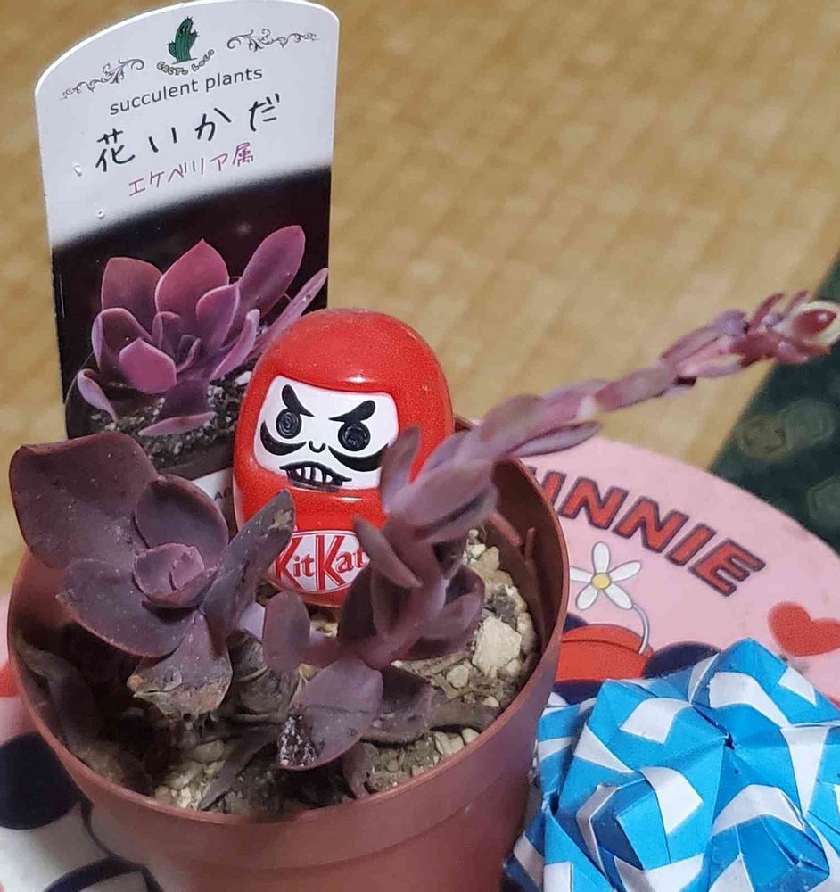 今日はだるま祭りということで、特別参加のキットカットのおまけ?のちょっと怒った顔のだるまさんと、花いかだというエケベリア属の多肉ちゃんです。