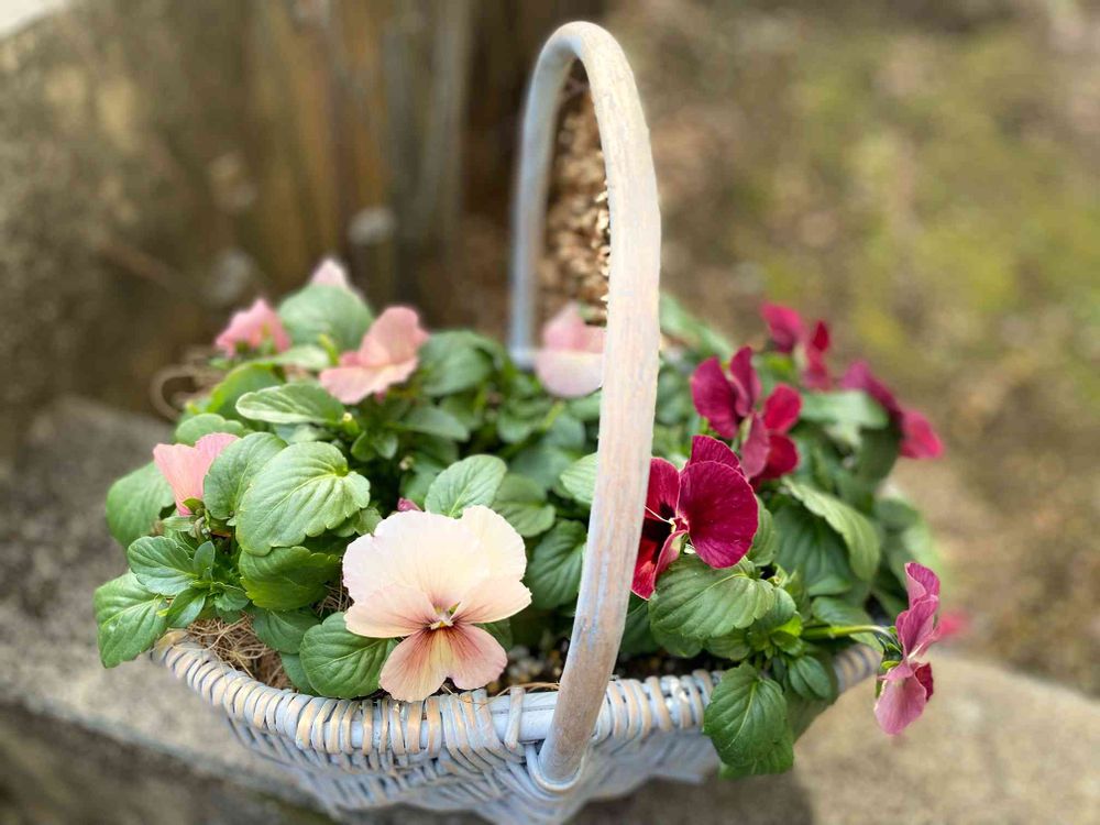 ステキな花籠に優しいアプリコットカラーの寄せ植えがステキです❣️