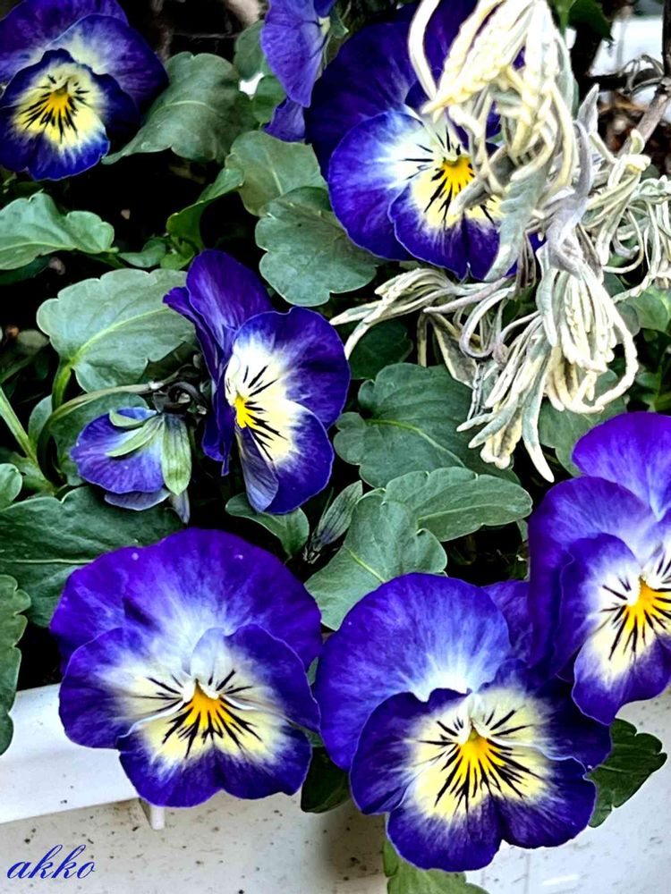 可愛いビオラが、寄せ植えの鉢から溢れて来ました