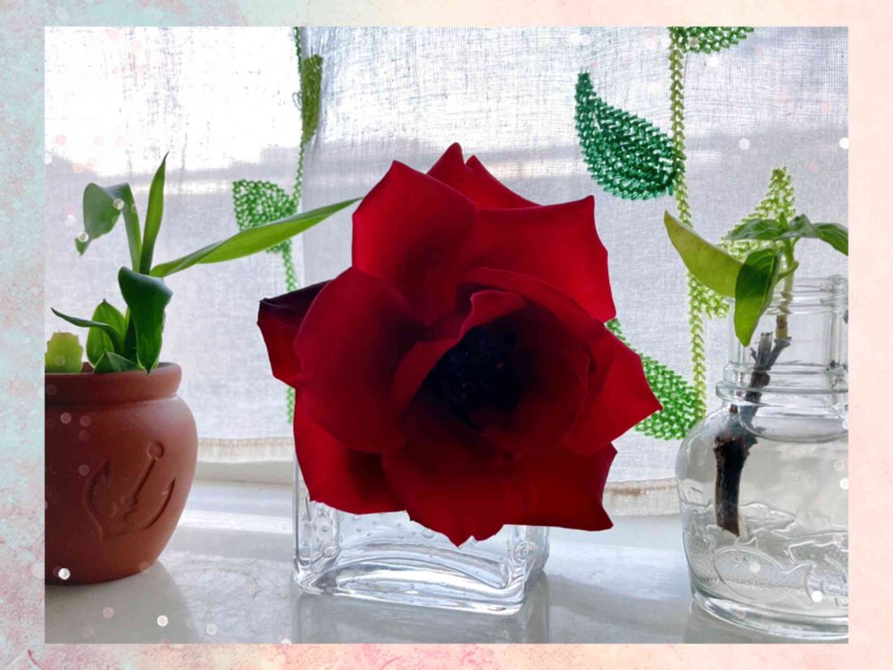 ずっと蕾のままだった薔薇を窓辺に飾ったら