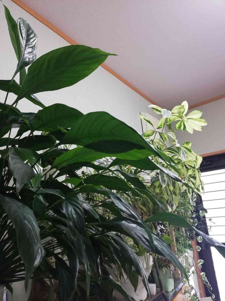 同じ植物💚🌿スパティフィラムとカポック(シェフレラ)が同じ所のままなので少しだけですがアングルを変えて🍋🍀*゜