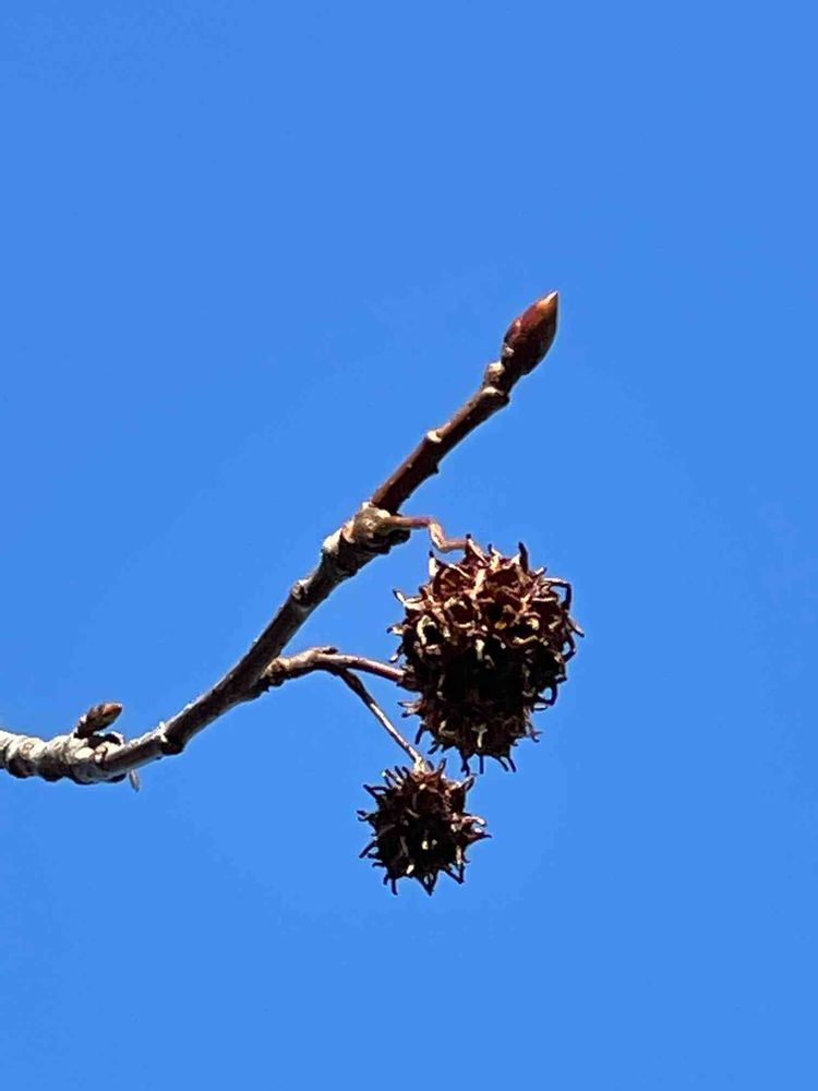 モミジバフウの枝先の新芽が、少し膨らみ始めでいる感じです