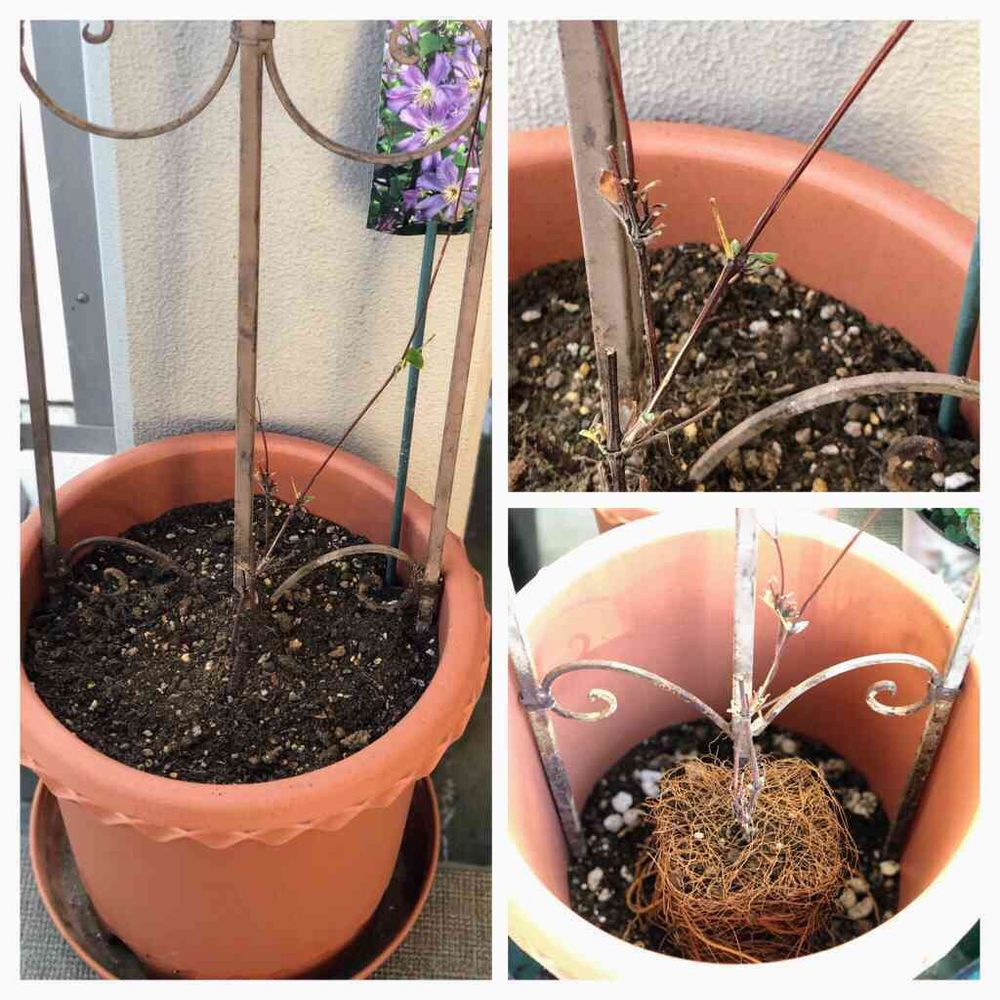 ビチセラ系のクレマチス プリンス・チャールズ(4.5号サイズ)2年生を植え替えました。こちらは、根がかなり張っていたのと、節の幅が広く深植えが8号鉢では出来そうになかったので、10号鉢に植え替えました。