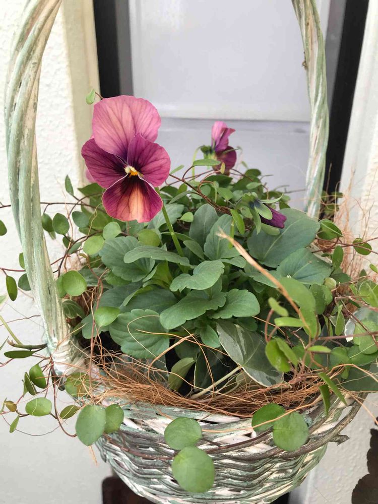 アレンジで頂いたカゴにペイントしてパンジーを植えてみました
