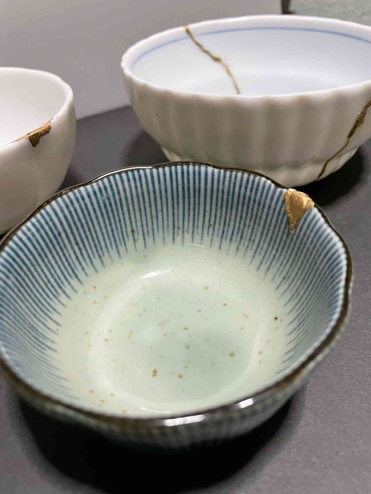 簡易金継ぎなので、金粉は本物なのか分からないです。🤔ケチケチして透明漆にうす〜く溶かして筆で塗ってます( ' ꒳ ' )