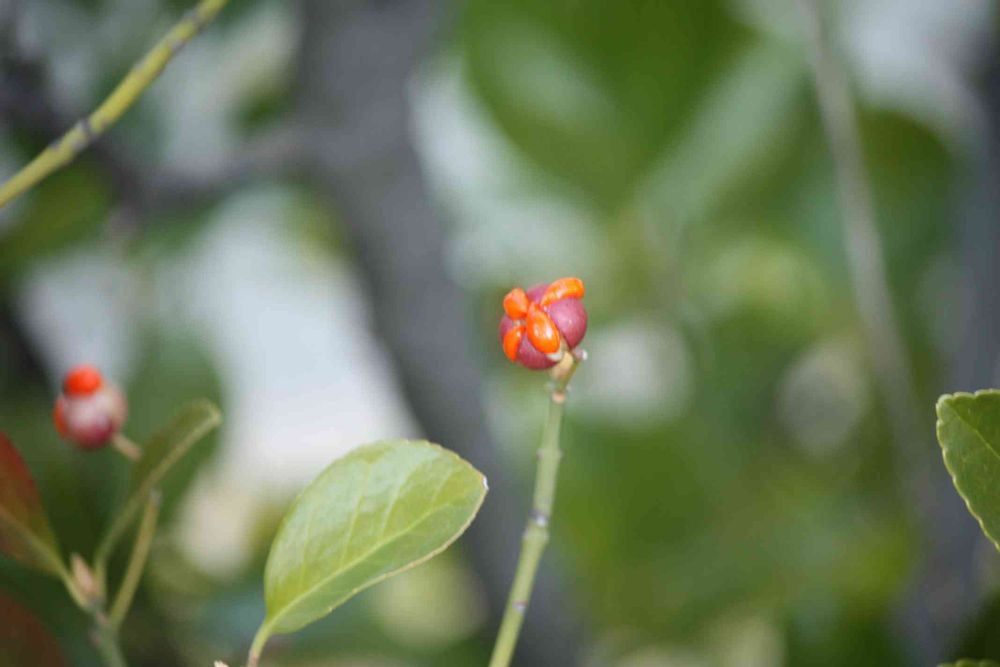 わりと不規則に殻が割れて、ぷりんとオレンジ色の実がのぞきますが、この実はキレイに4裂した殻の裂け目から、規則正しくオレンジ色がのぞいていました🎶