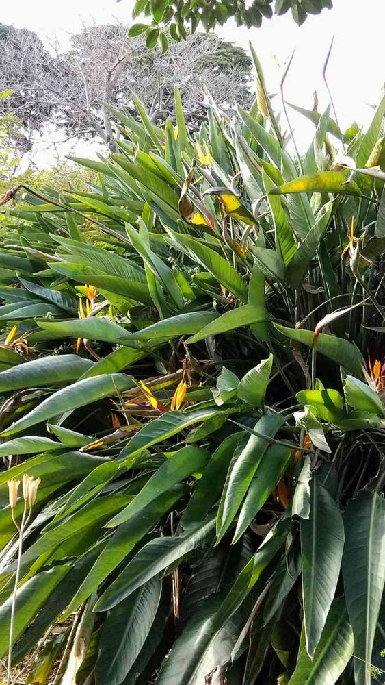 伊豆のフラワーガーデンにモリモリの葉っぱのストレリチア、お花は埋もれてます。