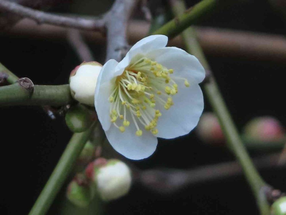 護国神社の境内、白梅の蕾が膨らみ、1輪だけ可愛いらしく咲いていました。