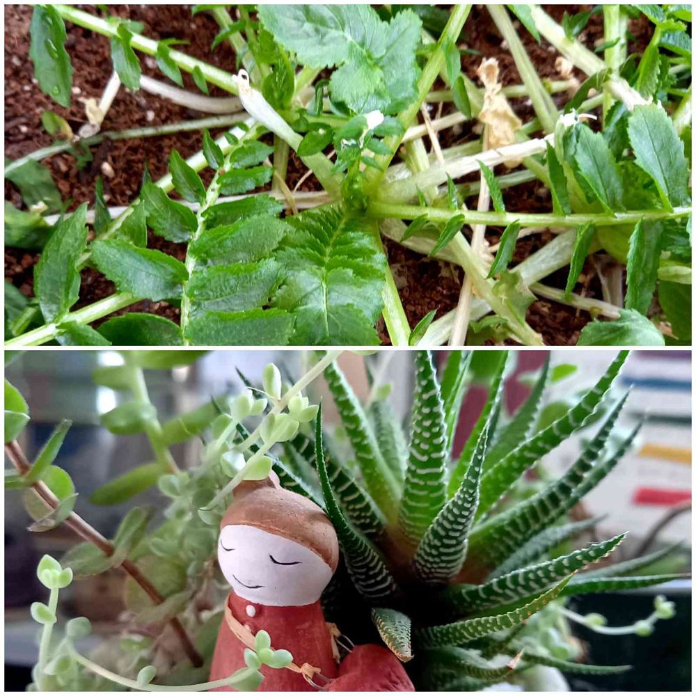 しばれた大根の葉っぱ❗覗いて見たら、ひょろひょろ大根が育っている。七草粥に使おうーと😋