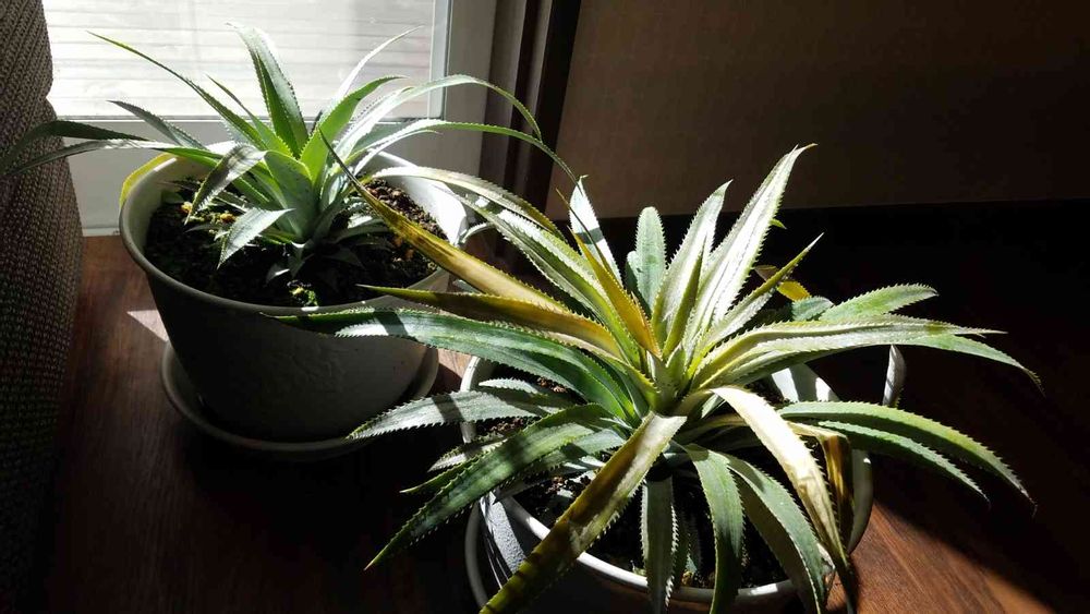 小さなビニールハウスで外で管理してたのですが、手前のパイナップルの葉っぱが黄色くなってしまいましたーー😱😱