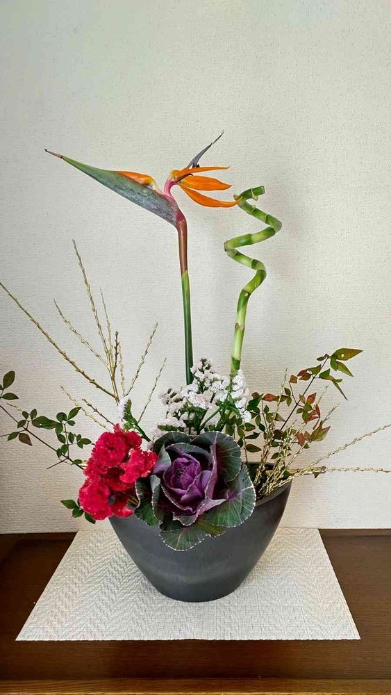 今日はお休みなのでお正月花を少しずつ小さくしていこうと…投げ入れのものをまた違う作品にしてみました。お正月花作品その3の1番難しかった投げ入れのものを解体しこのアレンジに。イマイチの投げ入れ作品が…このようにまとまりやっと満足しました〜(笑)✌️😆✌️