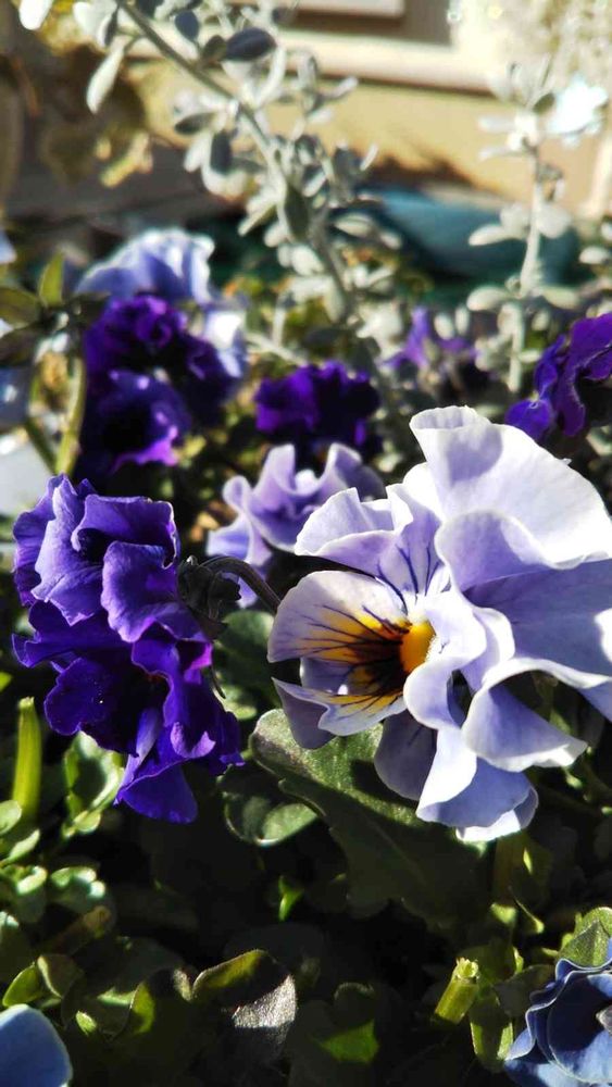 紫色のビオラ、陽を浴びて輝いていますね