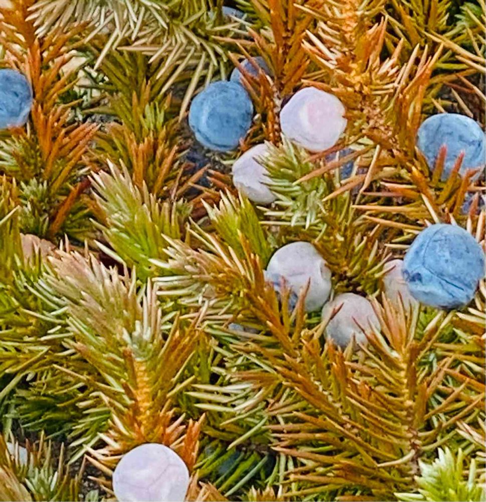セイヨウネズはヒノキ科ビャクシン属の常緑低木で針葉樹(コニファー)。ネズは「ネズミサシ」のこと。雌雄異株。葉っぱは螺旋状につく。風媒花。英語でジュニパーベリーと呼ばれ、酒のジン🍸の香りづけに使われる。