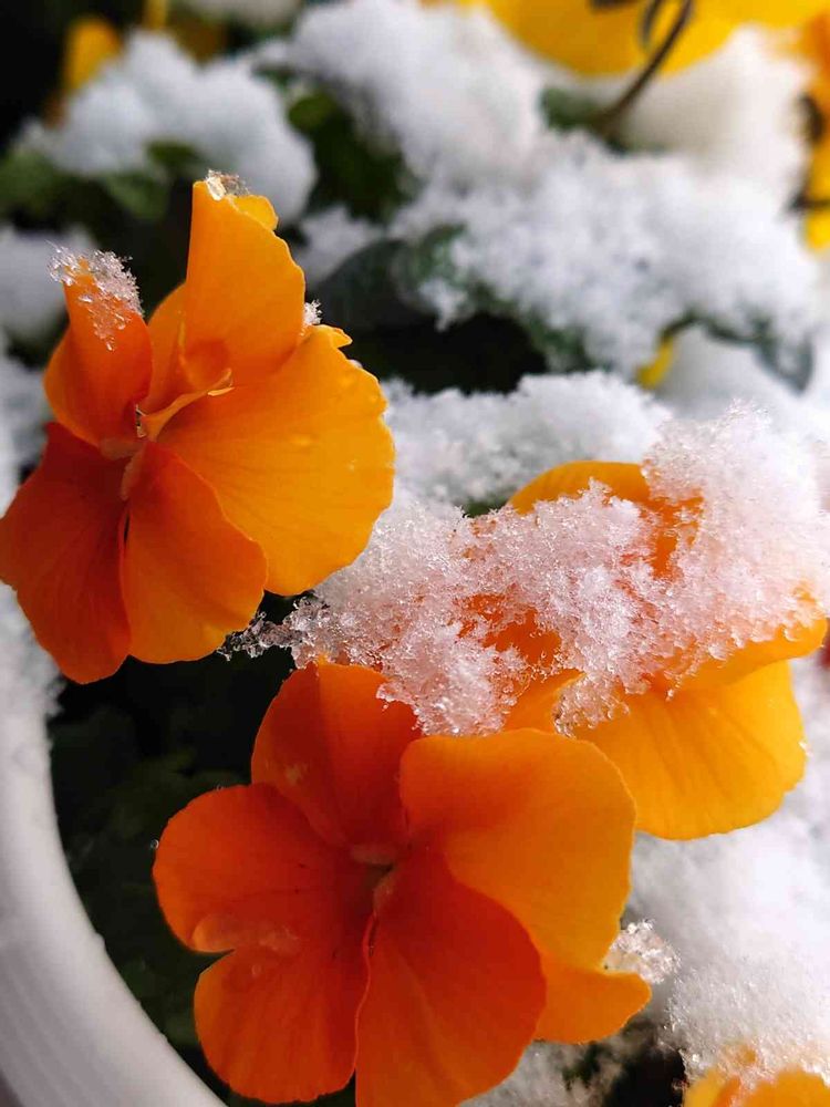 橙色のビオラ🌼もあるんやね🤗雪に埋もれる姿も、綺麗やね🎵