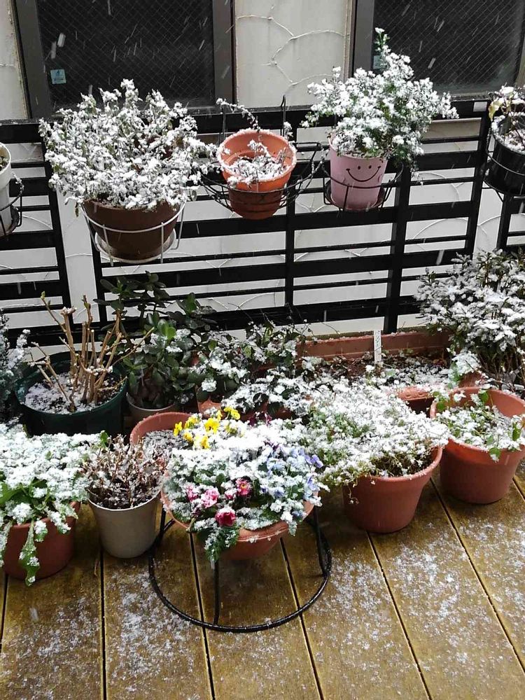 初雪さっき❄️粉雪❄️だったのが段々積もって☃️来て、お花が寒そう((( ;゚Д゚)))ガクガクブルブル