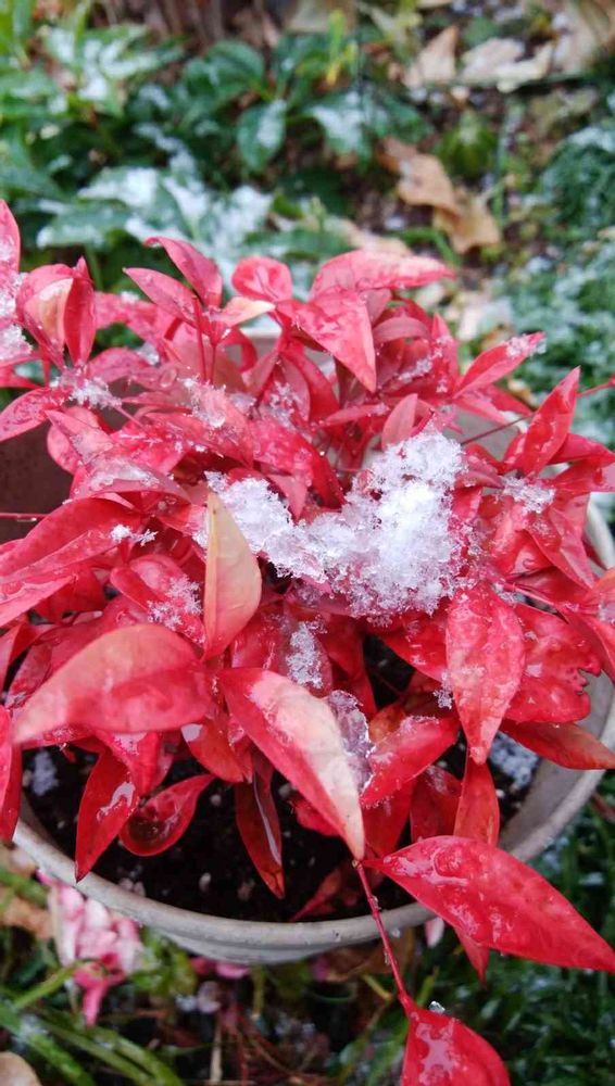 オタフクナンテンの赤い🌿に雪が積もって可愛ね☃️❄️