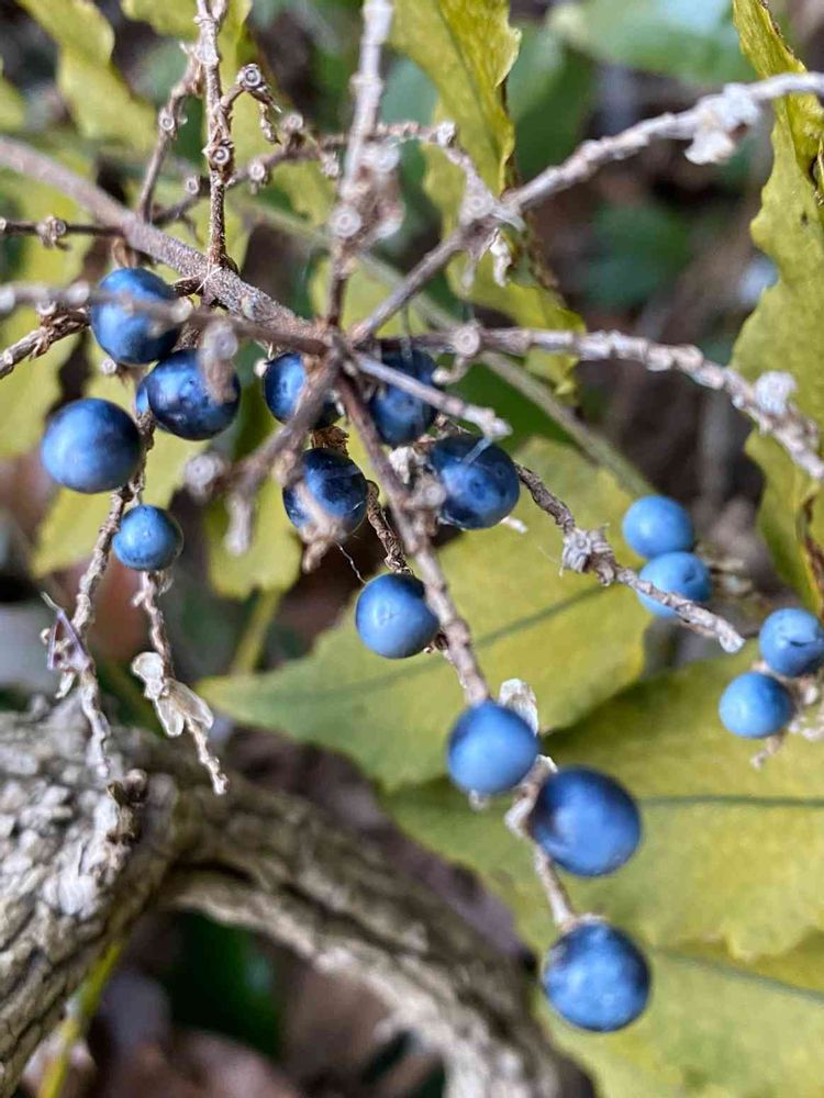 ヤブミョウガの実、寒さの中、青く輝いていました💙