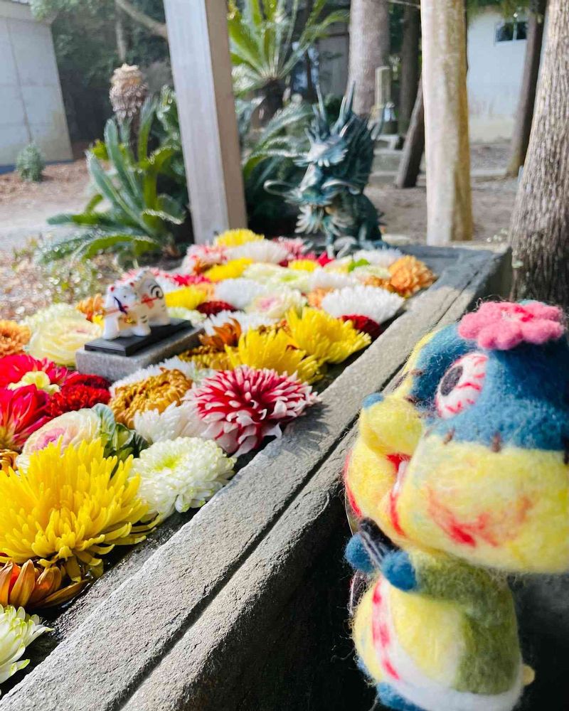 鳴門市の『宇佐八幡神社』さんの花手水に虎さんがいました🐯( ◉ ω ◉ ✿)♡