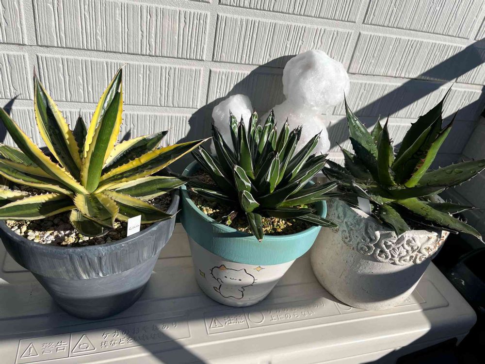 ベランダに積もった雪で作った☃️と棚に入らず極寒のベランダに放置されてた大きなアガベ達💦