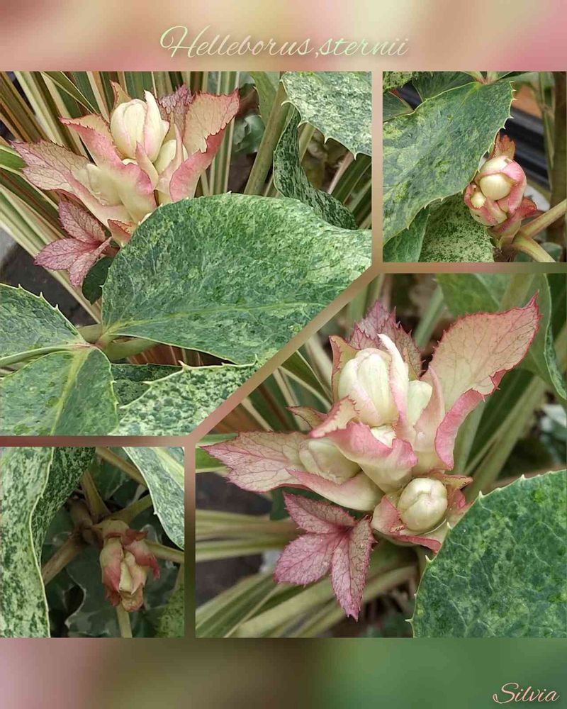 ♣️ステルニー(Helleborus sternii)はリビダスとアーグチフォリウスの交配種。リビダスのワインカラーとアーグチフォリウスの緑色が混ざったようで、花のつきも多い品種。♣️