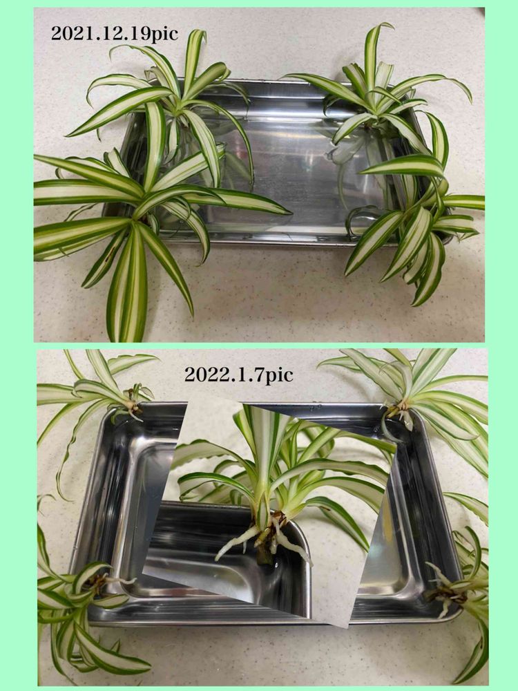 ランナーの子株を植えるのに根っこをある程度まで伸ばそうとお水に浸けています。少し伸びました。
