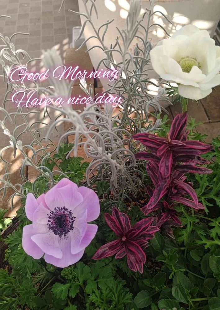 寄せ植えのアネモネさんのコンビが咲いてくれてます。
