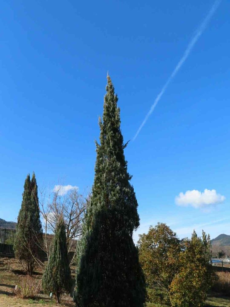 澄み切った青空、浮き雲と飛行機雲、コニファーが一体となり、爽やかな光景を見せてくれました。