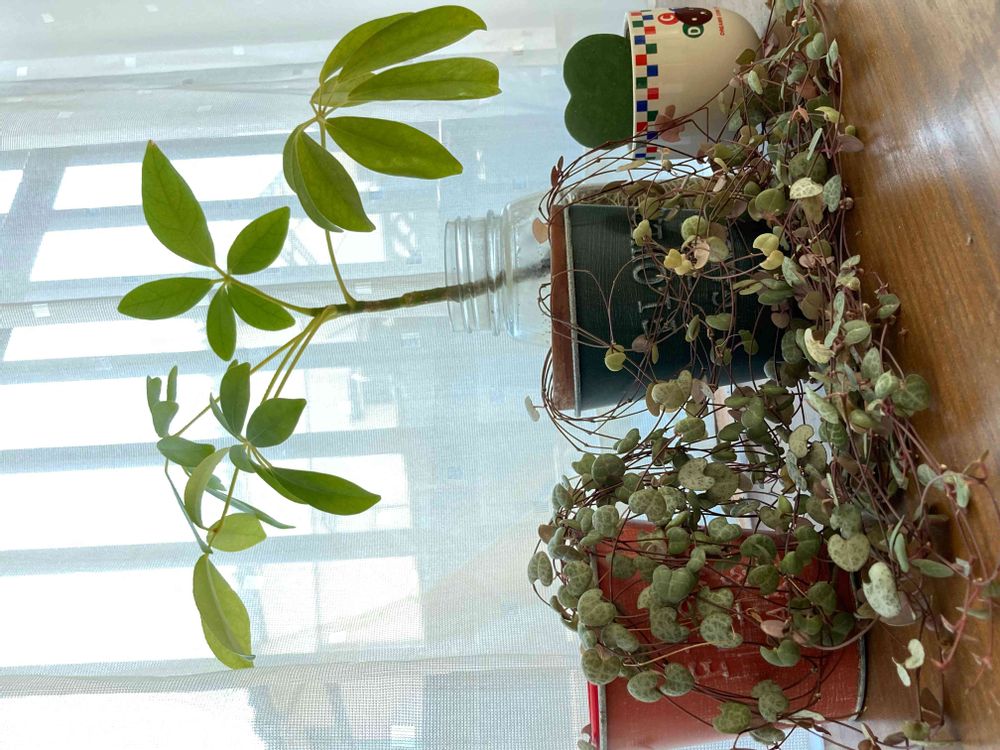 ハートカズラは何年か前に地上部を枯らしちゃったけど…、復活してくれてこんな感じに😊 伸びてきたらチョッキン✂️して挿していってたんですけど…九州に来てからは伸ばし放題🤣垂らすためにのせていた台は猫さんの水置き台になってます🐈⬛ これからどう飾ろうかな。