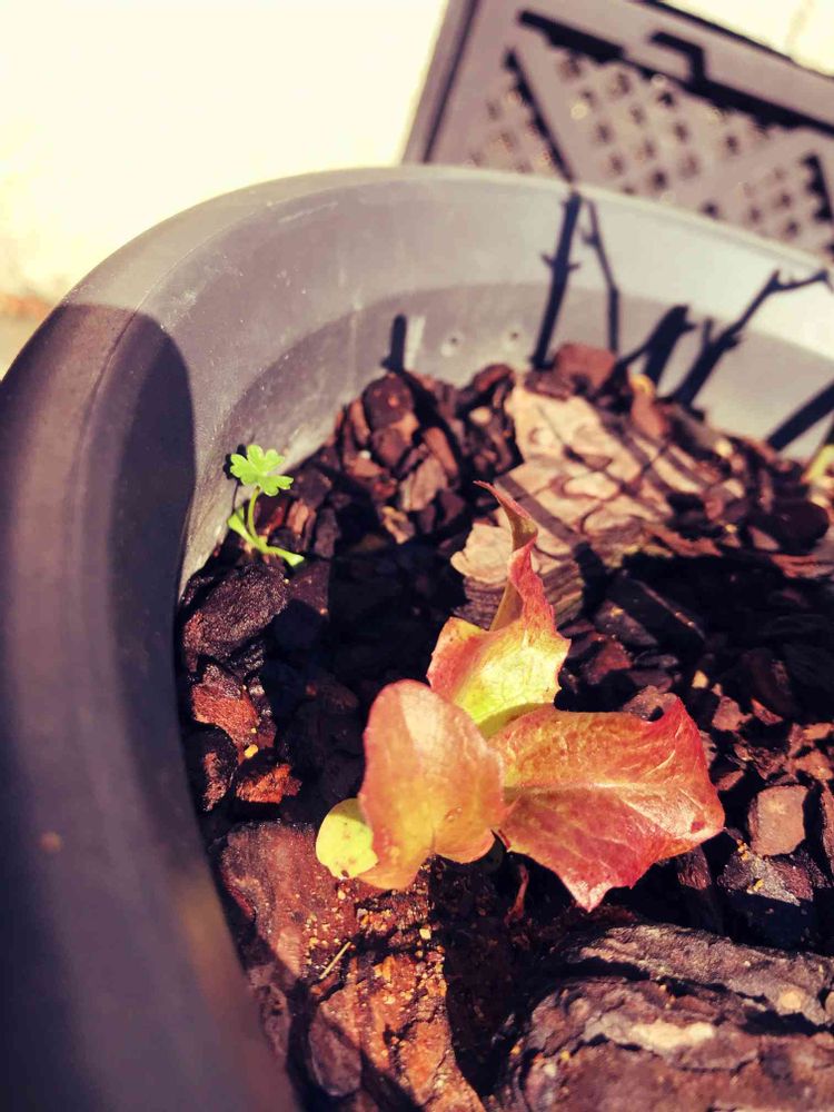 放置しすぎたサニーレタスの種が飛んでて、庭のあちこちに生えてきました。。。