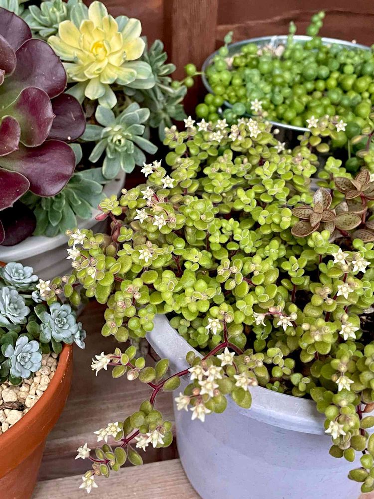 ブロウメアナさんも、ヴォルケンシーさんも、クラッスラ属なんですよね❣️小さな白い花がそっくりです( *´꒳`*)♡セダムはすぐ消えちゃうけど、この子達は結構長く居ます(*^^*)