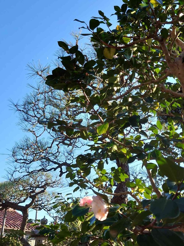庭の散策中、椿越しの松越しに小さな小さな三日月が見えました👀