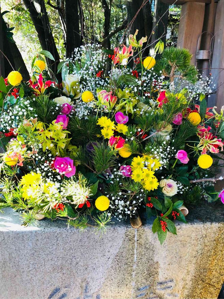 昨日のお詣りの神社の手水舎🌸🌼🌺☘️